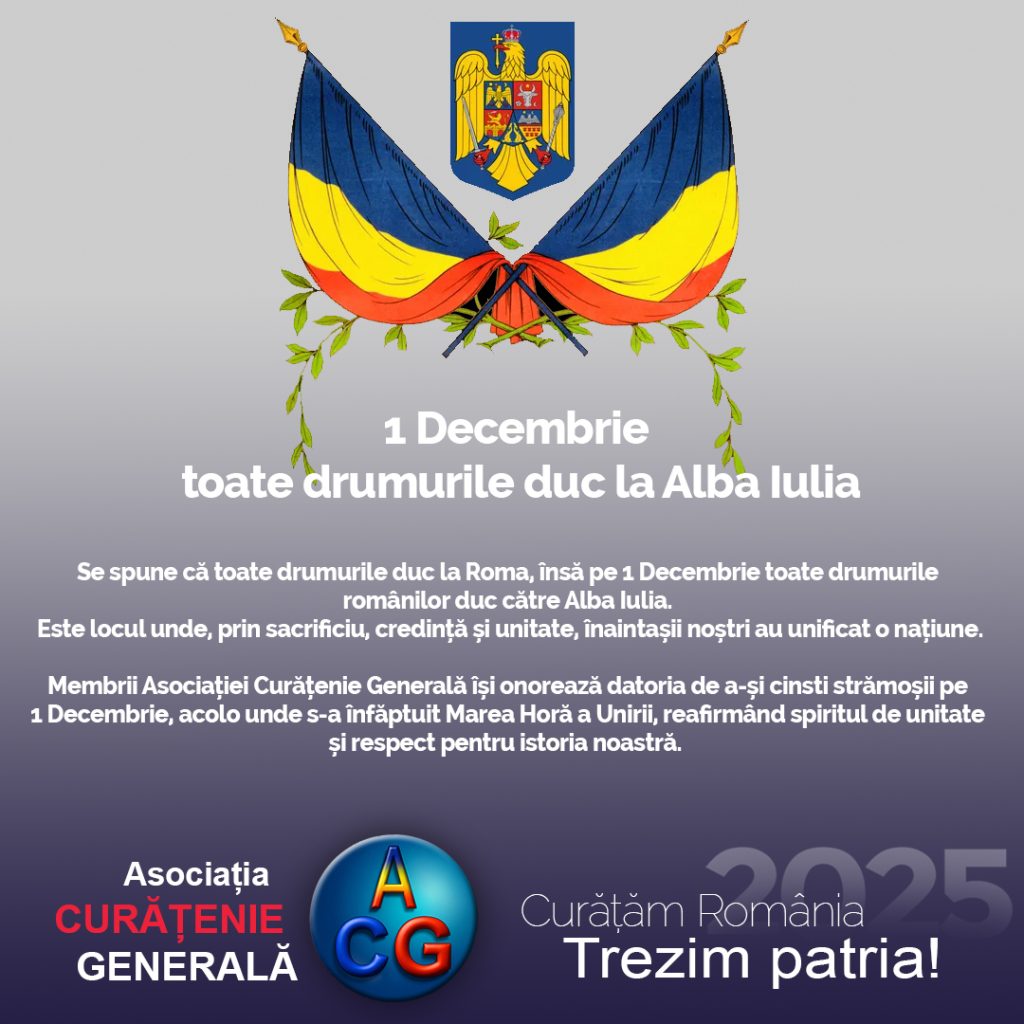 Pe data de 1 Decembrie 2025, de Ziua Națională a României, membrii Asociației Curățenie Generală se alătură Președintelui ales de popor, domnul Călin Georgescu, și vor cinsti România și strămoșii neamului prin depunerea de coroane de flori la Obeliscul „Horea, Cloșca și Crișan” din Alba Iulia, începând cu ora 9:00. Vă așteptăm alături de noi să sărbătorim împreună Marea Unire și demnitatea românească!