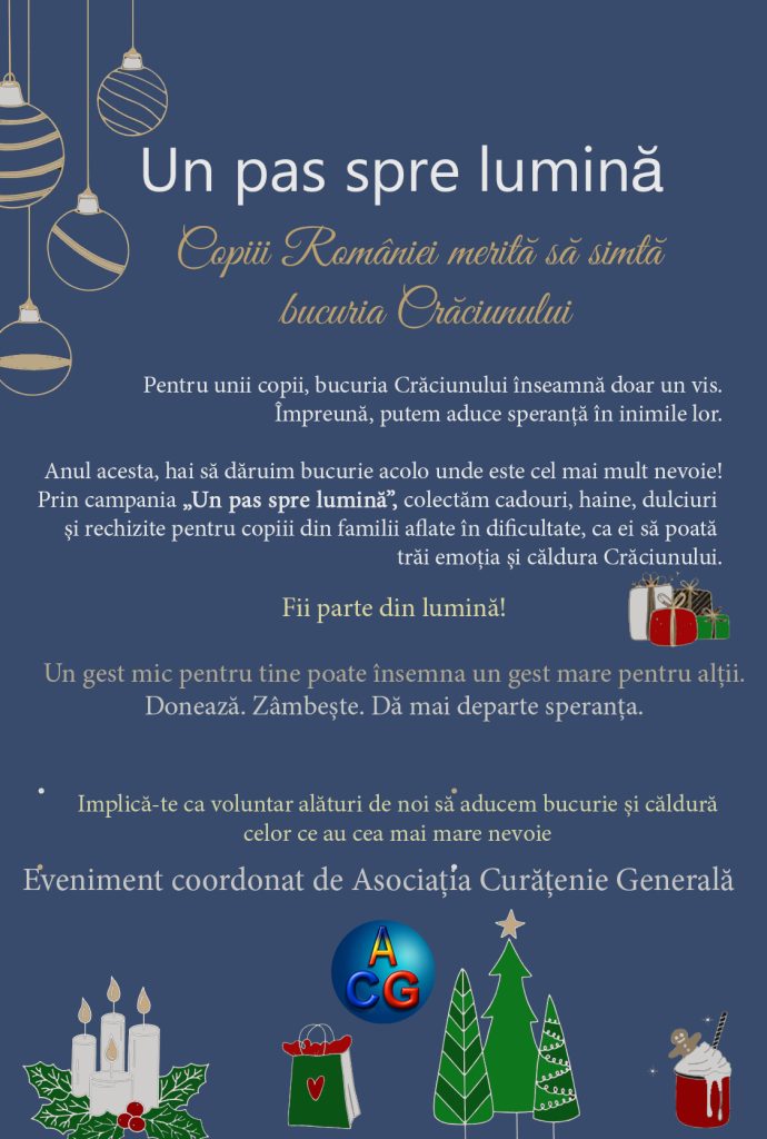 Asociația Curățenie Generală coordonează această inițiativă cu scopul de a strânge cadouri, îmbrăcăminte, dulciuri și rechizite pentru copiii aflați în situații dificile. Fiecare donație reprezintă un gest de solidaritate și un pas către un Crăciun în care nici o familie nu este uitată.